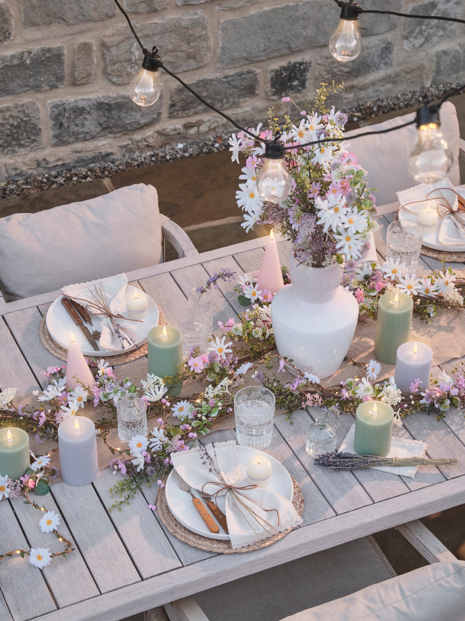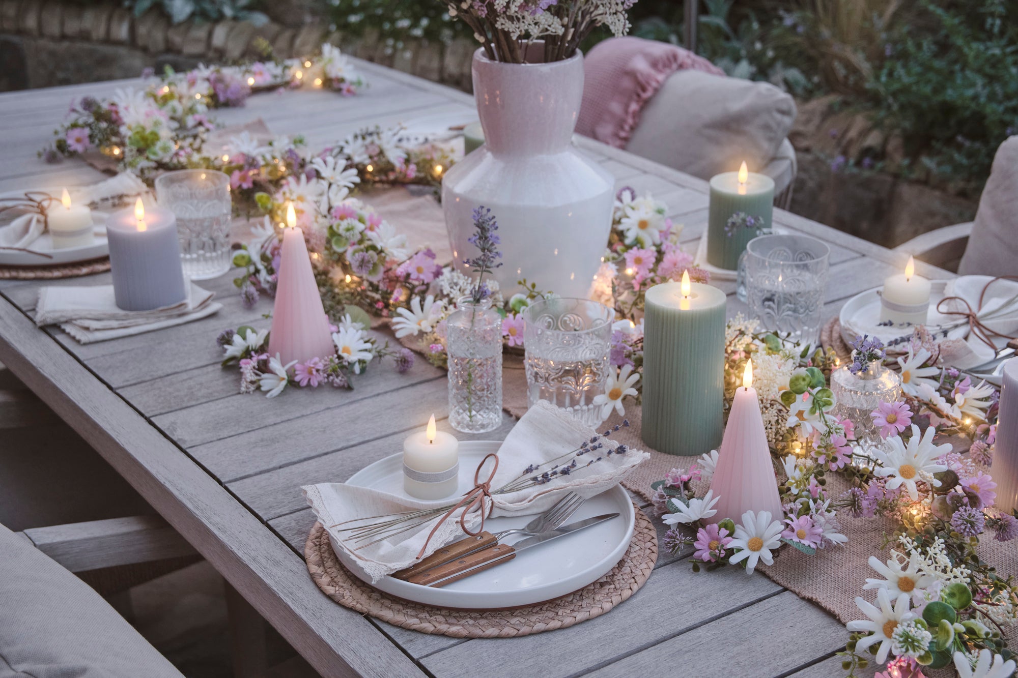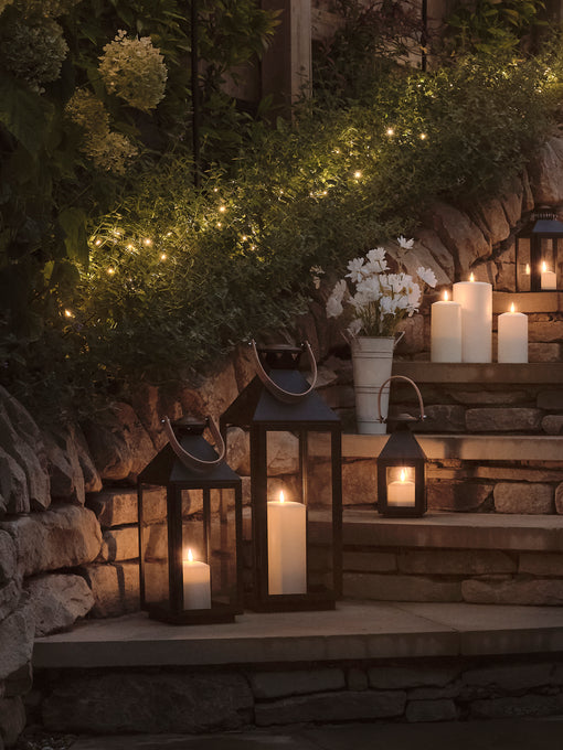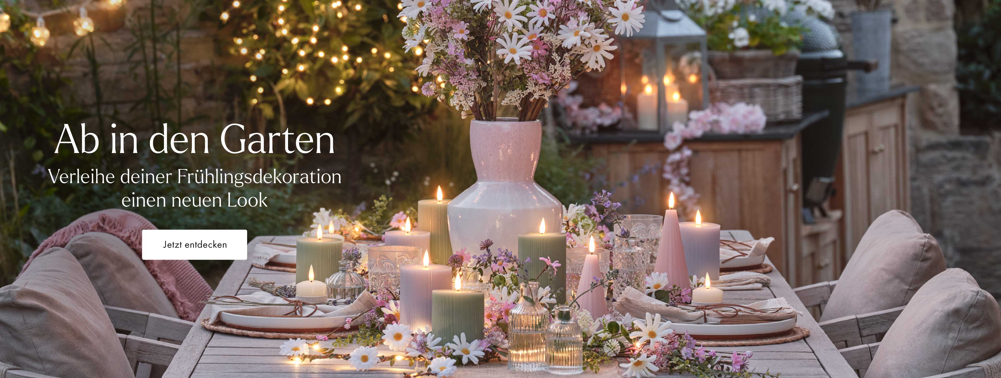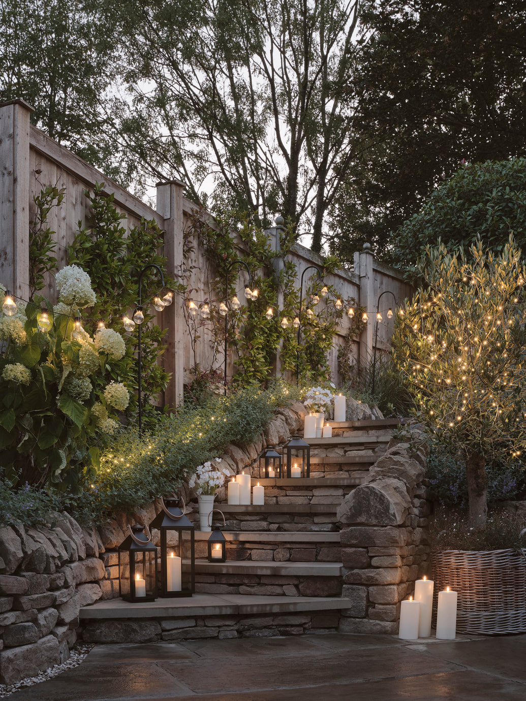 Klassische Lichterketten tauchen die Terrassen in ein einladendes, goldenes Licht. Die Blumenbeete funkeln im Schein der Lichter, während flackernde Laternen einen sanften Glanz verbreiten.