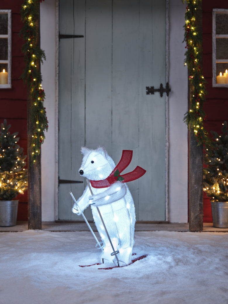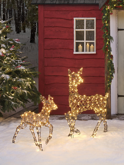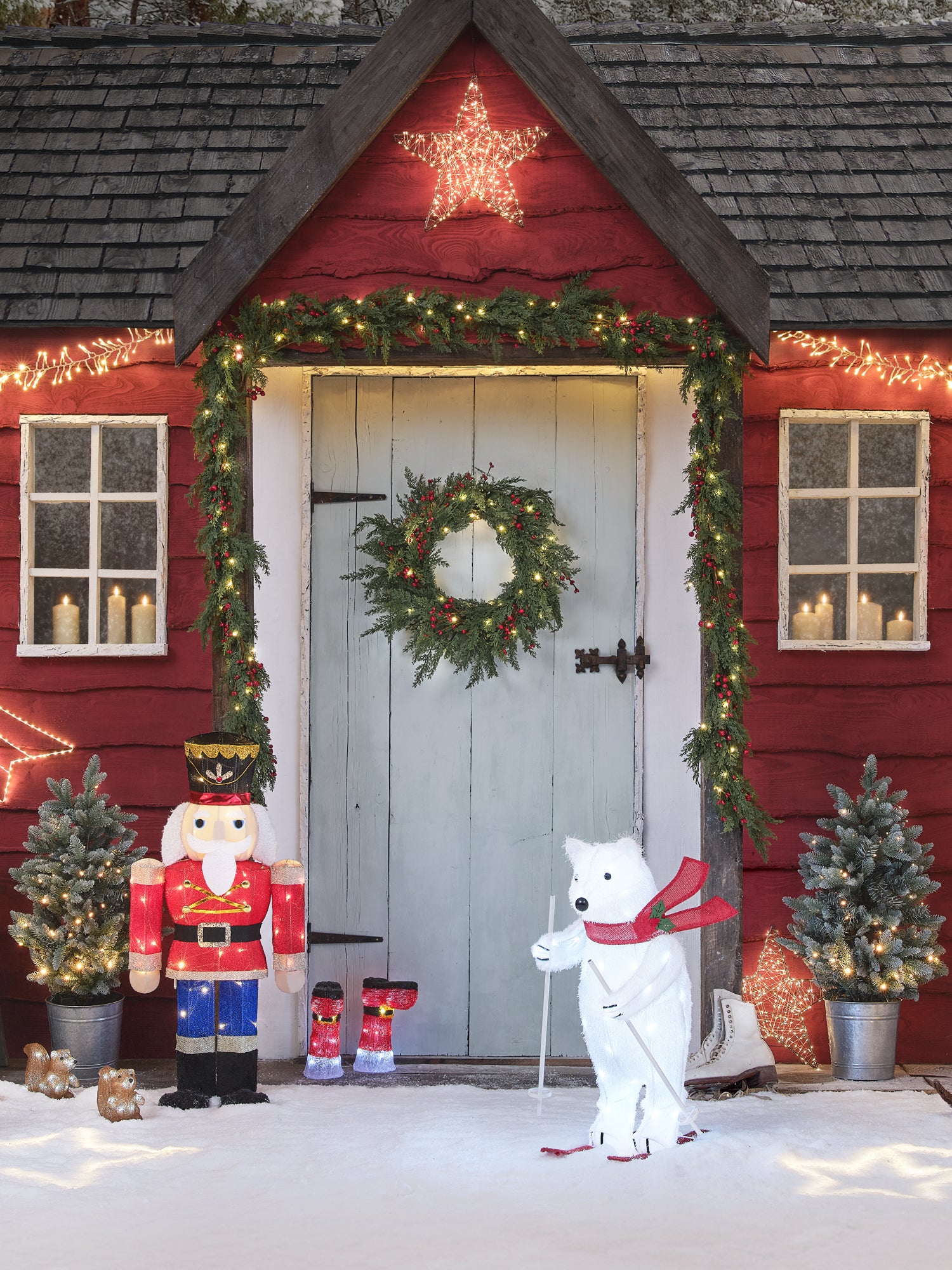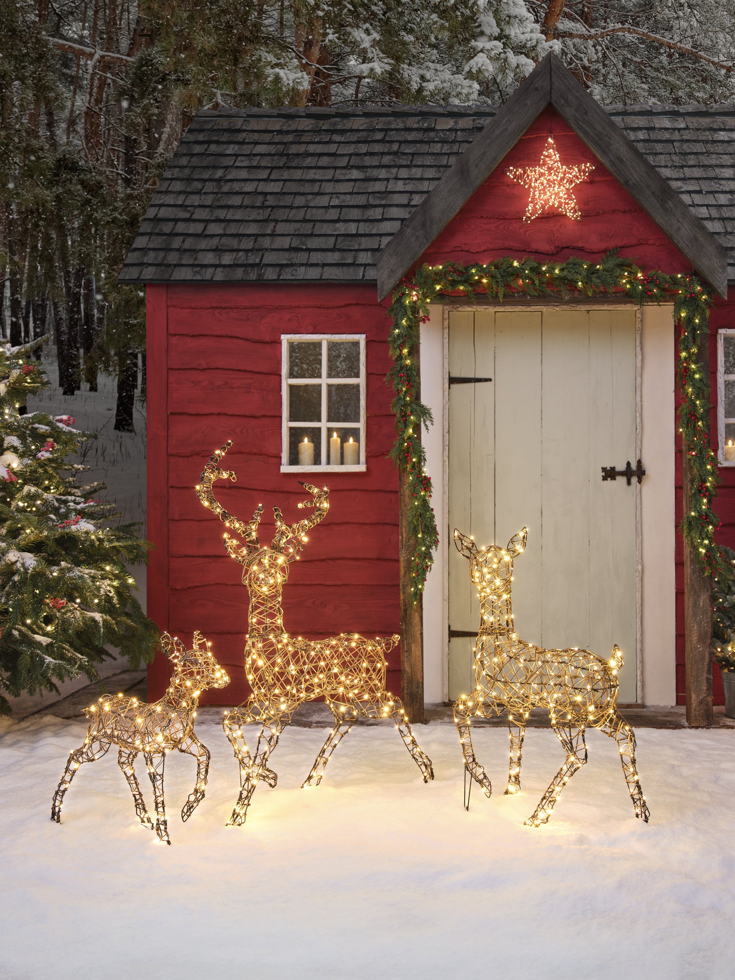 Gärten, Terrassen, Innenhöfe und Veranden verwandeln sich in dieser klassischen Weihnachtsgeschichte in wunderbar festliche Orte. Es ist die Zeit für rote Wangen, rote Schleifen und dampfende Tassen Kakao – und jedes Fleckchen im Freien erstrahlt im Sternenlicht. Rattan-Rentiere leuchten auf schneeweißen Rasenflächen, Veranden funkeln mit vereisten Tannen und Laternen, und Haustüren heißen die festliche Zeit mit Kränzen aus rubinroten Beeren willkommen.
