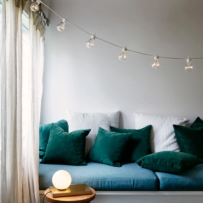 LED-Lichterketten sind für Schlafzimmer die beste Wahl, da diese nicht heiß werden und so auch in Verbindung mit Stoffen sicher sind. Wenn du große Vintage Glühbirnen liebst, aber keinen Platz für eine Party Lichterkette im Schlafzimmer hast, erzielst du auch mit einer Tischlampe mit großer Glühbirne einen schönen Effekt.