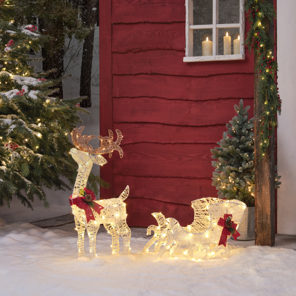 Unsere Rentier- und Schlittenfiguren für außen bestehen aus hochwertigen, wetterfesten Materialien – perfekt für lange Winternächte. Die integrierten LEDs leuchten besonders hell und erzeugen ein warmes, einladendes Ambiente. Dank praktischer Timer-Funktionen und stabilen Rahmen lassen sie sich mühelos installieren und sorgen verlässlich für stimmungsvolle Festtage.