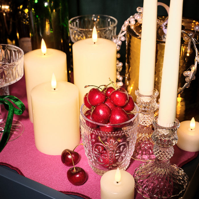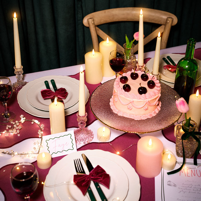 Nichts trägt mehr zu einer stimmungsvollen Atmosphäre bei als sanftes Licht. LED-Kerzen sind eine wunderbare Alternative zu echten Kerzen, da sie nicht nur sicherer, sondern auch vielseitiger einsetzbar sind. Sie imitieren den warmen Schein einer Flamme, ohne dabei zu tropfen oder nach einer Weile zu erlöschen. Platziere die LED-Kerzen auf dem Tisch oder auch auf dem Boden, um den Raum in sanftes Licht zu hüllen. Achte darauf, unterschiedliche Größen von Kerzen zu nutzen, wie eine Kombination aus Stabkerzen, Stumpenkerzen und Teelichtern. Dies verleiht deiner Tischdekoration mehr Tiefe. Lichterketten sind ein weiteres Must-have für ein schönes Dinner Setting. Drapiere sie locker über Möbelstücke, entlang des Tischs, oder hänge sie an die Wand, um den Raum zum Leuchten zu bringen. Besonders schön wirkt die Kombination von Mikro-Lichterketten mit Lichterketten in Form von Herzen oder Rosen.